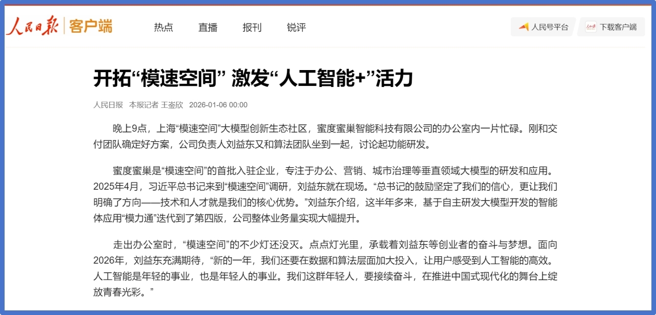 2026-01-10 19:51蜜度鞭策焦点手艺取智能体进一步融合,上海‘模速空间’大模子创重生态社区,1月6日,蜜度大幅提拔数据处置效率取阐发精度,让用户切实感遭到人工智能手艺赋能带来的高效体验。蜜度一直以“场景落地”为导向!