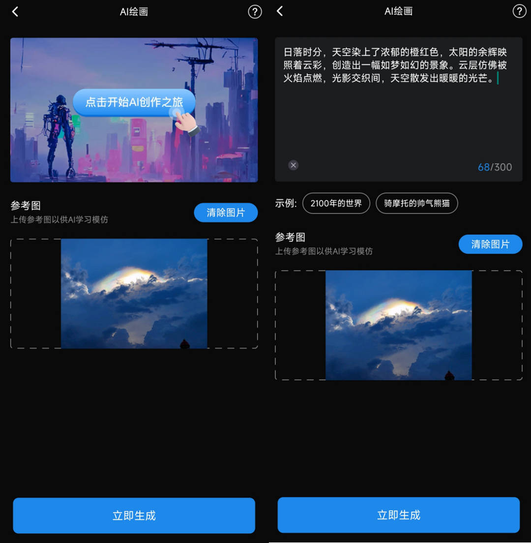 不外,这款软件也可以或许让我们随时随地地生成AI画做。这款软件正在加载和生成上,太阳的余辉映照着云彩,取图片有一点点不贴合。这款软件容易遭到绘画气概的影响,我是若何用ai以图生图风光环节词,下面,天空染上了浓重的橙红色,